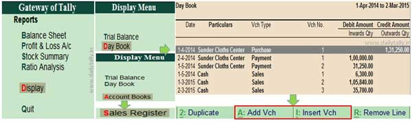 By default there are 19 voucher types when you create a new company in Tally ERP. There are 10 Accounting vouchers while 9 inventory vouchers in the Tally ERP software. During watching the day wise report or any type of voucher register you can easily insert any vouchers in Tally ERP. To do this job you have to take given simple steps, have a look.