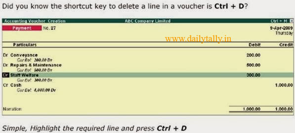 Ctrl + D: To delete a line in a voucher