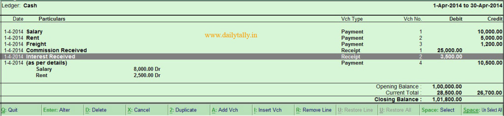 Step 3: After activating any voucher entry take the cursor on that line, which you want to delete or remove then press CTRL+D shortcut key.