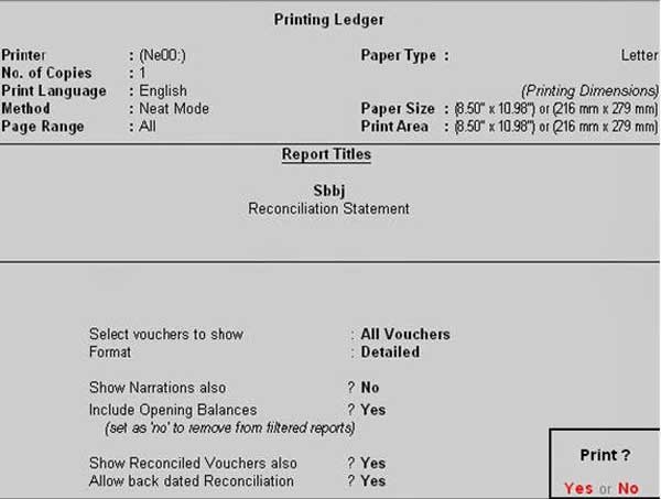 Press F5 again to view or print bank reconciliation statement -> Press Alt + P -> set following options “yes” in Printing Ledger box -> Enter.