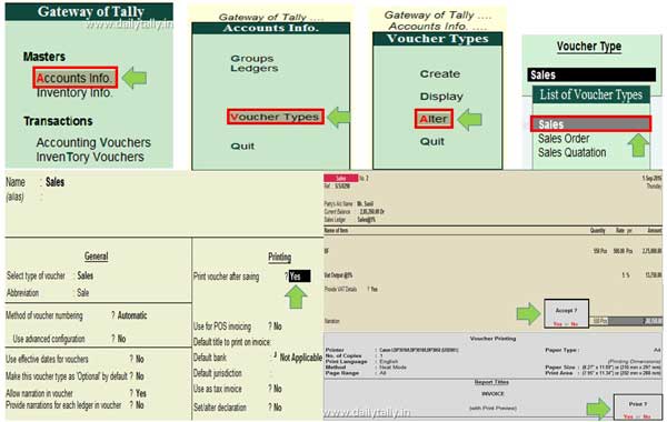 Step 4: Make entry in the sales vouchers from GOT (Gateway of Tally) > Accounting Vouchers > Press F8 or click on the “Sales Vouchers”. Now, after saving the voucher you will get voucher printing dialogue box. If you press or choose “Yes” option then you will get hardcopy of active voucher transaction.