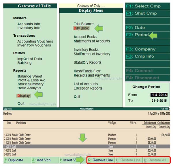 Step 4: If you want to hide or remove any particular line or lines from day book reporting section then first select the line and press “Alt+R” to remove the line. Now you will be able to easily hide or remove lines one by one. If you want to get back hidden or removed line one by one then you have to press “Alt+U” which is used to quick restore one by one line. If you want to get back all hidden or remove lines in Tally ERP then you have to press “Ctrl+U” which is used to quick restore all lines.