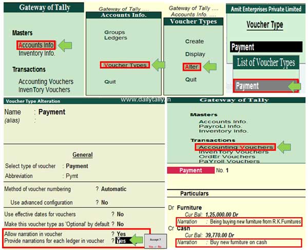 For eg: You have to apply narration for each ledger during making entry in the payment voucher then you have to take given simple steps, have a look.