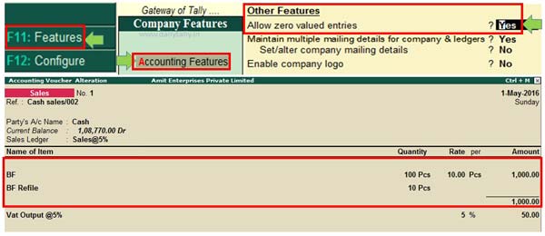 Step 2: Press F11 > Press F1 (Accounting Feature) > Set “Allow zero valued entries” – Yes. To save this feature either press enter or press Ctrl+A for quick save the feature.