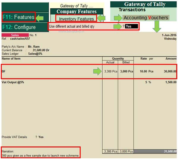 This option is differ from allow zero value entry in Tally ERP. You have to use different stock item for free sample or exchange damaged goods in allow zero value entry feature in Tally ERP. While you have to use same stock item as a free sample to increase the sales volume in your business or exchange the damaged goods with the help of different actual and billed quantity feature in Tally ERP.